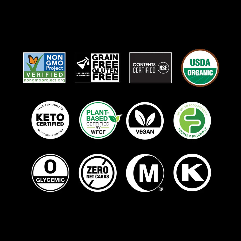 Delicious, Non-GMO Project Verified, Keto Certified, Plant-based Certified, Kosher, Halal, Sugar, Syrup & Snacks!